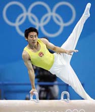 Teng, de 19 a?os, quien terminó en cuarto lugar en caballo con arzones en los campeonatos mundiales del 2002 y empató con el japonés Takehiro Kashima en el primer lugar del evento en el mundial del 2003, aterrizó en la colchoneta siendo el último de los ocho competidores y provocó los aplausos de la audiencia con una hermosa rutina.