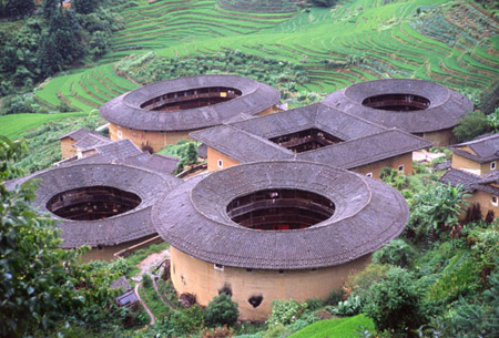 Las torres de tierra distribuyen principalment en el oeste de la provincia de Fujian. En el pasado, debido al atraso económico y a la comunicación difícil había muchos bandidos y peleas armadas en esta zona. Así que después de bajar de la cuenca del río Amarillo en el norte del país, los hakkas, una rama de los hans (etnia mayoritaria de China), construyeron torres de tierra a modo de castillo, que son una especie de viviendas peculiares para defenderse de los bandidos. Estas torres son económicas, sólidas y adecuadas para la defensa propia y tienen un alto valor de arte.
