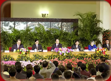 En la primera sesión de la X Asamblea Popular Nacional celebrada en Beijing del 5 al 18 de marzo de 2003 se llevaron a cabo las elecciones según la ley y se tomó la decisión de nombrar los miembros del nuevo organismo estatal . En la sesión, a través de la votación, se tomó la decisión de que Wen Jiabao asumiera el cargo de primer ministro del Consejo de Estado y Huang Ju, Wu Yi, Zheng Peiyan y Hui Liangyu, los cargos de vicep - primeros ministros del Consejo de Estado.