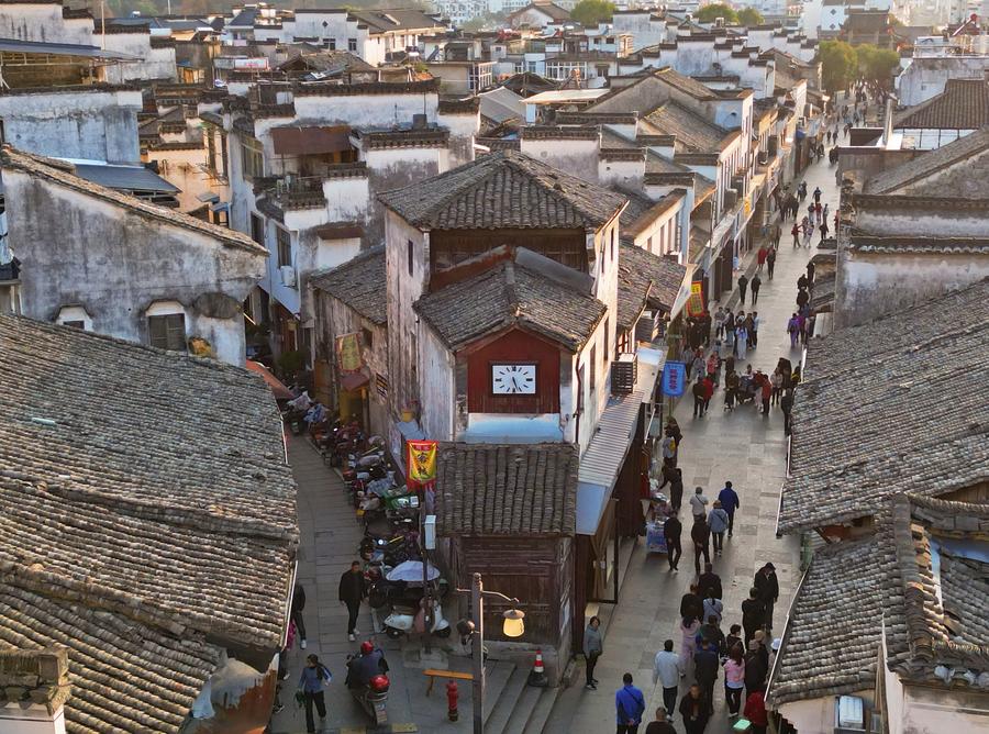 Una foto aérea tomada con un dron el 19 de marzo de 2025 muestra el campanario de la calle Zhonghe de la ciudad antigua de Huizhou, en el distrito de Shexian, provincia oriental china de Anhui. (Xinhua/Guo Chen.)