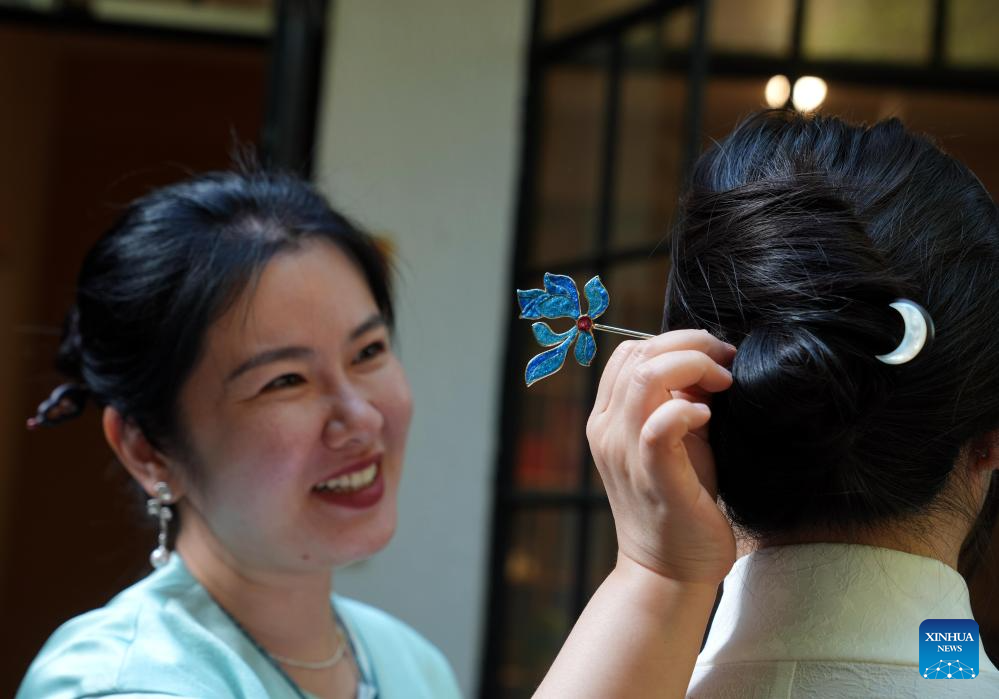 Li Wen ajusta un accesorio para el pelo a una ni?a en ?Jinkun Xinshe?, un estudio de artesanía tradicional de estilo chino, en el distrito de Xuhui de Shanghai, este de China, el 18 de abril de 2025. (Xinhua/Liu Ying.)